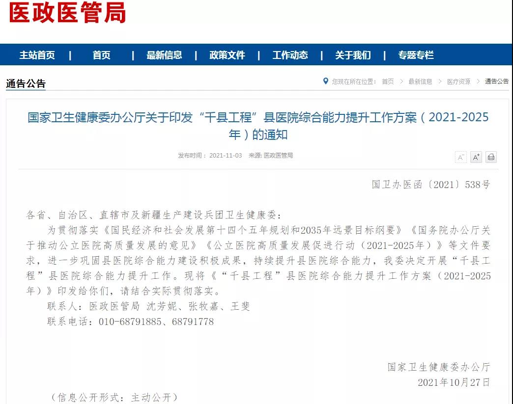 11月3日,國家衛生健康委印發《“千縣工程”縣醫院綜合能力提升工作方案(2021-2025年)》。《方案》明確,“千縣工程”縣醫院綜合能力提升工作將推動省市優質醫療資源向縣域下沉,結合縣醫院提標擴能工程,補齊縣醫院醫療服務和管理能力短板,逐步實現縣域內醫療資源整合共享,有效落實縣醫院在縣域醫療服務體系中的龍頭作用和城鄉醫療服務體系中的橋梁紐帶作用,到2025年,全國至少1000家縣醫院達到三級醫院醫療服務能力水平,發揮縣域醫療中心作用,為實現一般病在市縣解決打下堅實基礎。